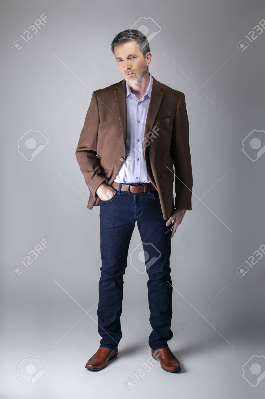 Bearded Middle Aged Fashion Model Posing With Business Casual Style Outfit For Mature And Confident Look The Trendy Brown Jacket And Jeans And Facial Hair Shows An Elegant Apparel Stock Photo Picture